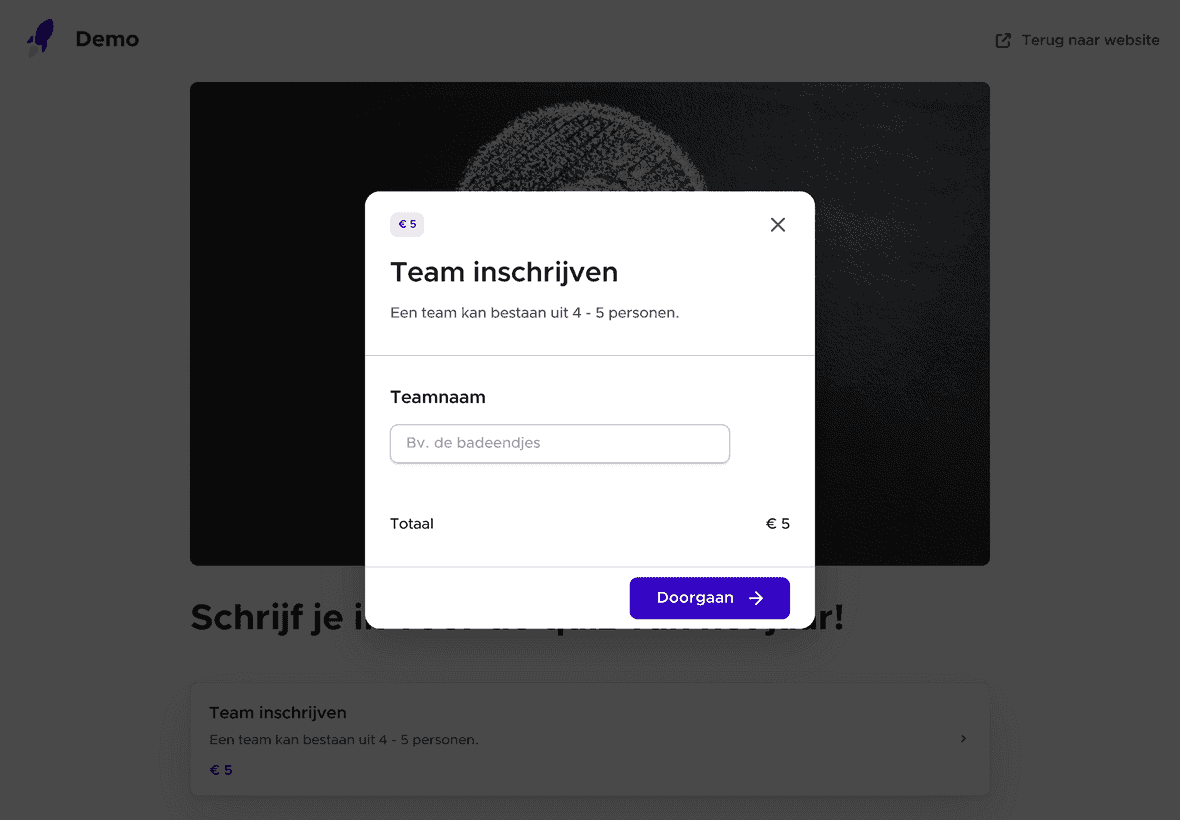 Een online formulier om je in te schrijven en te betalen, met of zonder tickets.