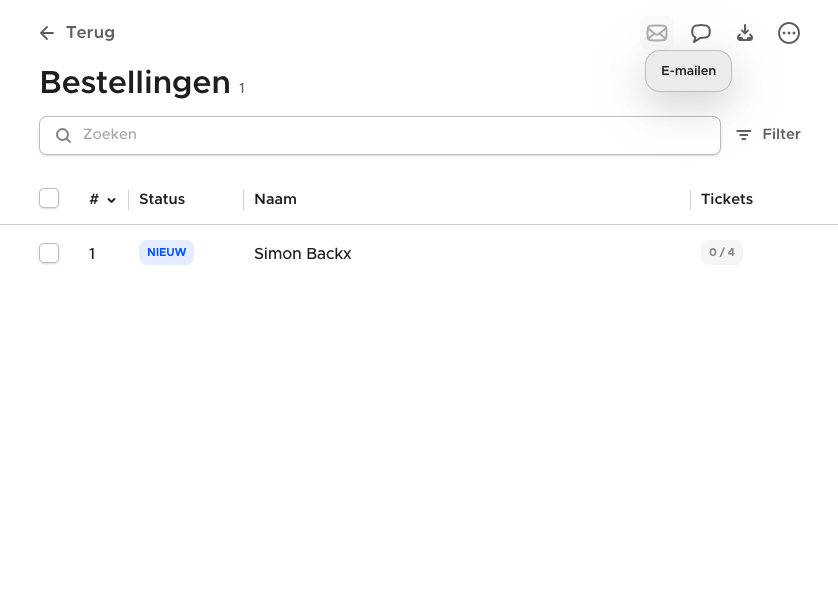 - Klik bovenaan op het 'Enveloppe'-icoontje om een e-mail op te stellen. Als je geen selectie had gemaakt, zal Stamhoofd naar alle bestellingen een e-mail versturen.