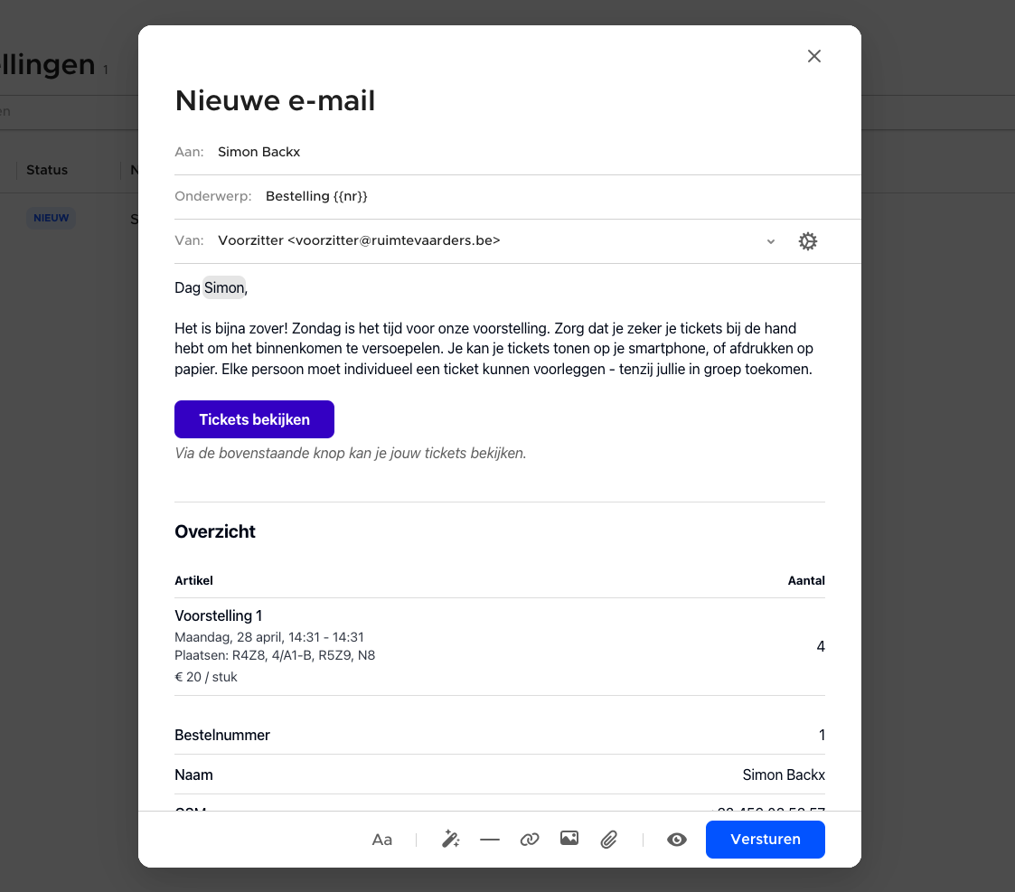 Een herinneringsmail sturen met de tickets of het bestellingsoverzicht