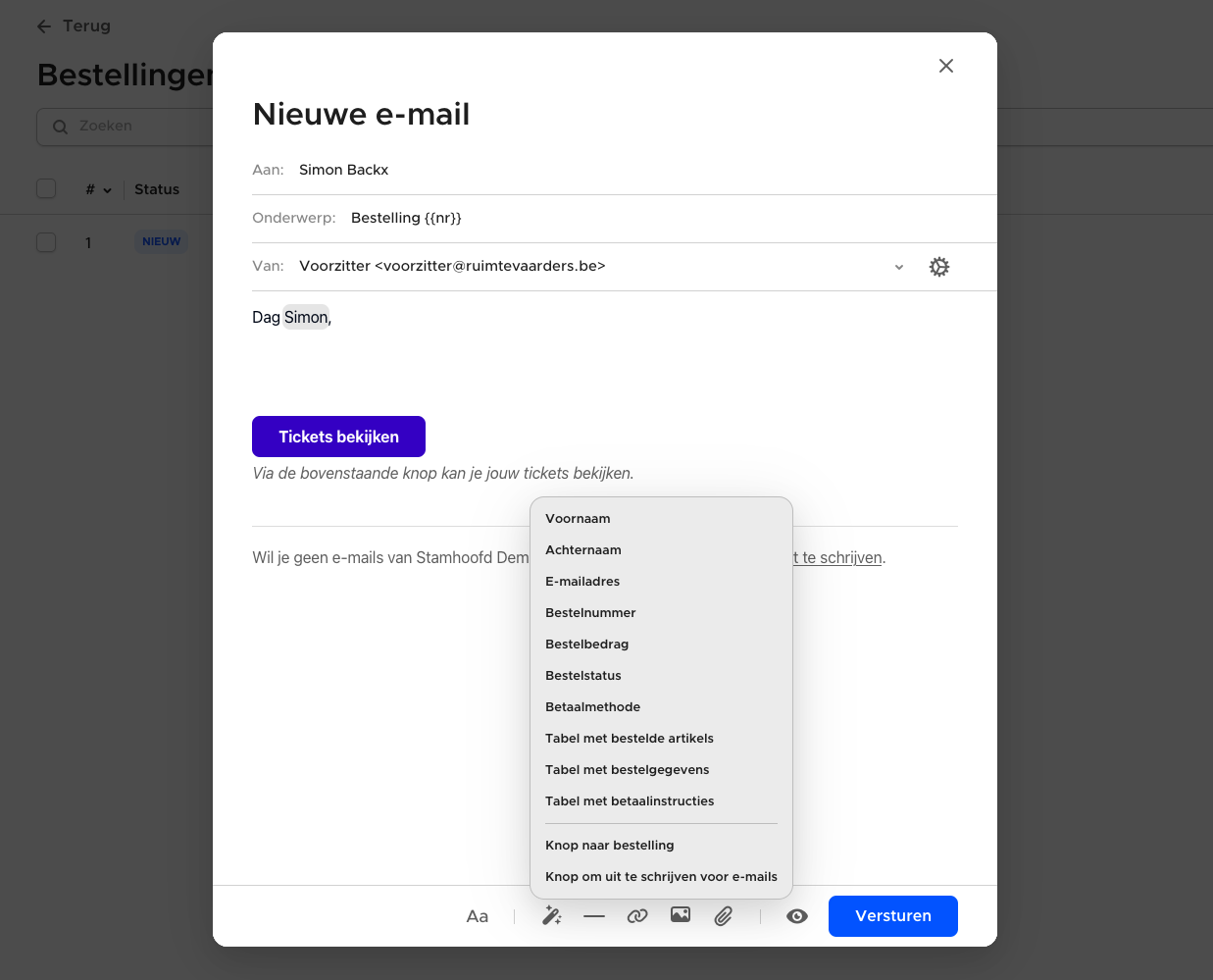 - Stel je e-mail op. Stamhoofd zal hier al automatisch een knop in plaatsen, maar je kan de tekst op de knop wijzigen naar wens. Als mensen op deze knop klikken, zullen ze naar de bestelling op jullie webshop gaan. Daar kunnen ze hun tickets ook downloaden. Voor een event met tickets kan je dus op de knop zetten 'Download tickets'. Voor een gewone verkoop of inzameling kan je ook bv. 'Bestelling nakijken' gebruiken. Dat kies je zelf.