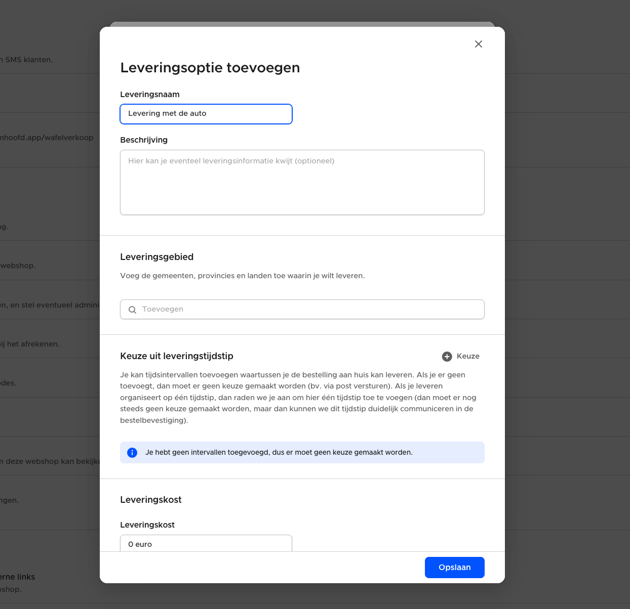 Begin met het aanmaken van een leveringsoptie. Doorgaans heb je maar één leveringsoptie nodig, maar je kan er meerdere toevoegen. Bv. stel dat je de keuze laat of je via BPost gaat versturen in heel België, of via de wagen zelf gaat leveren in en rond de gemeente (en dat beide aan een andere prijs wil aanbieden).