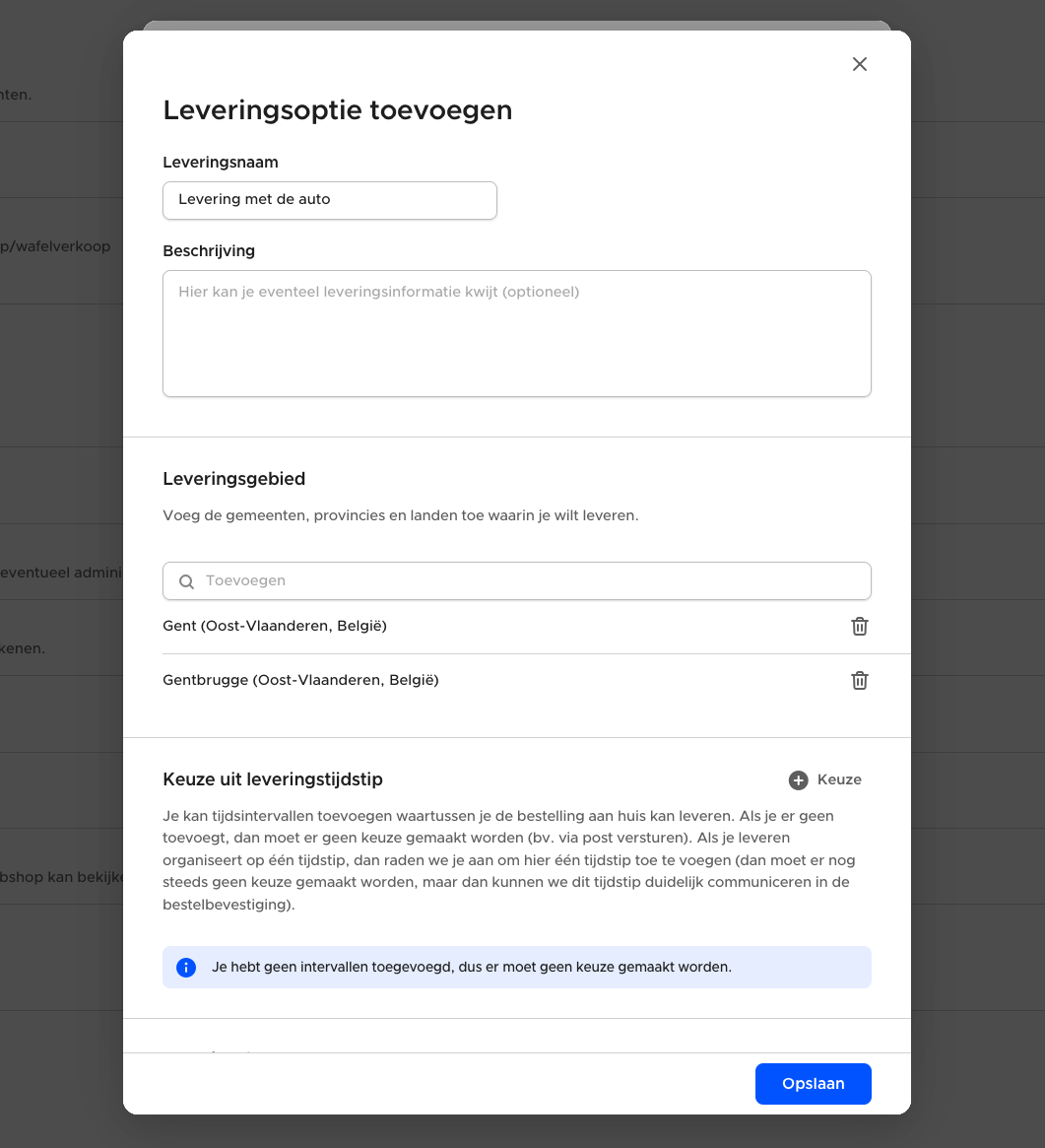 Vervolgens kan je optioneel alle tijdstippen toevoegen waarin je ongeveer zal leveren. Als je meer dan één tijdstip toevoegt, krijgt de besteller de keuze uit alle tijdstippen. Als je geen tijdstip toevoegd, is er geen keuze en is de leveringstermijn 'onbepaald' (bv. via Bpost).
