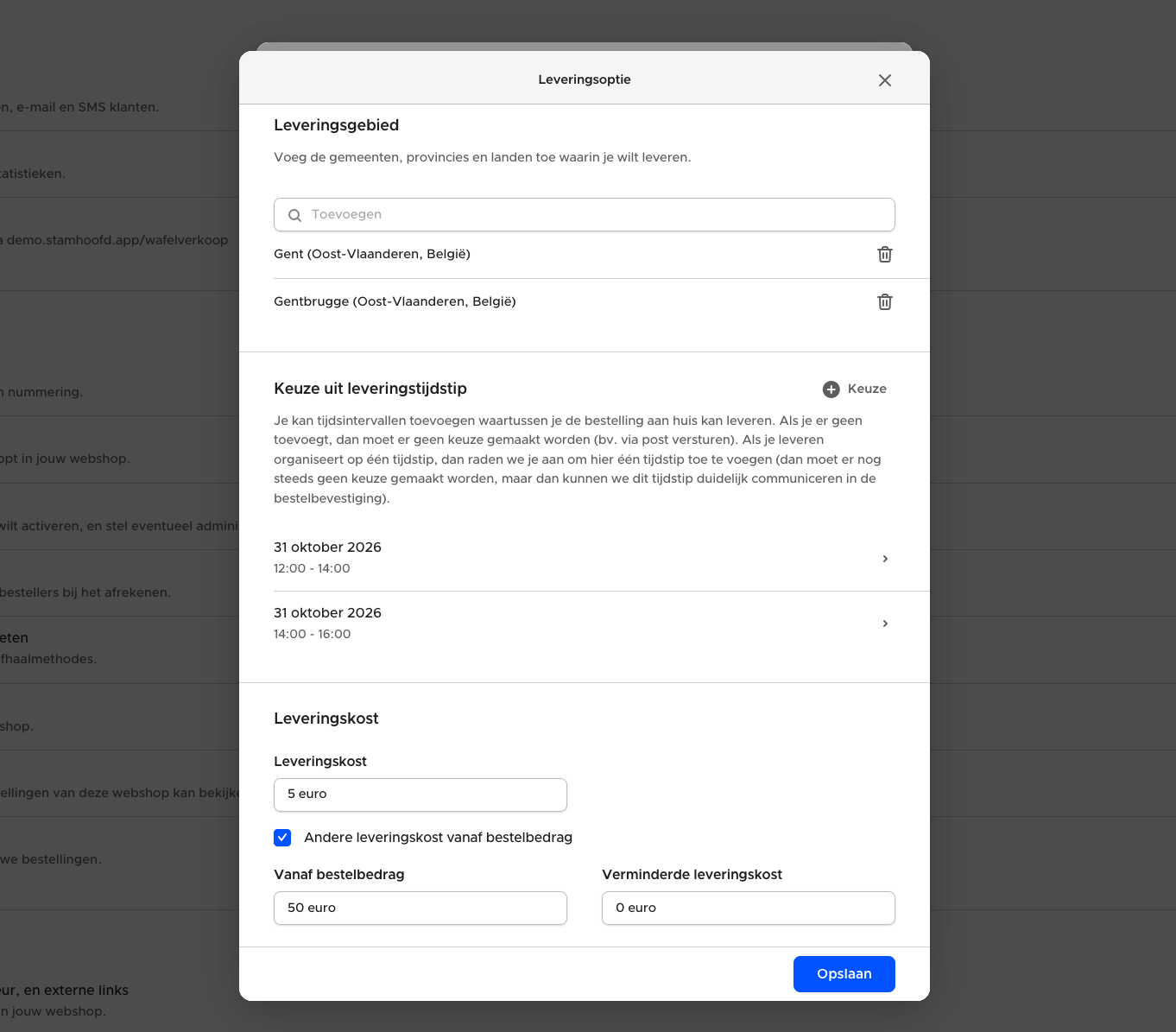 Onderaan kan je ten slotte nog een leveringskost instellen. Als je wilt kan je die kost laten wegvallen of verminderen vanaf een bepaald bestelbedrag.