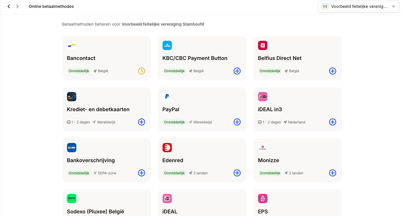 Eenmaal Mollie gekoppeld, mag je niet vergeten om de juiste betaalmethodes in Stamhoofd aan te vinken. Voor webshops doe je dat via de 'betaalmethodes' instelling van de webshop. Voor de ledenadministratie doe je dat via de Stamhoofd instellingen > 'Betaalmethodes voor inschrijvingen'.