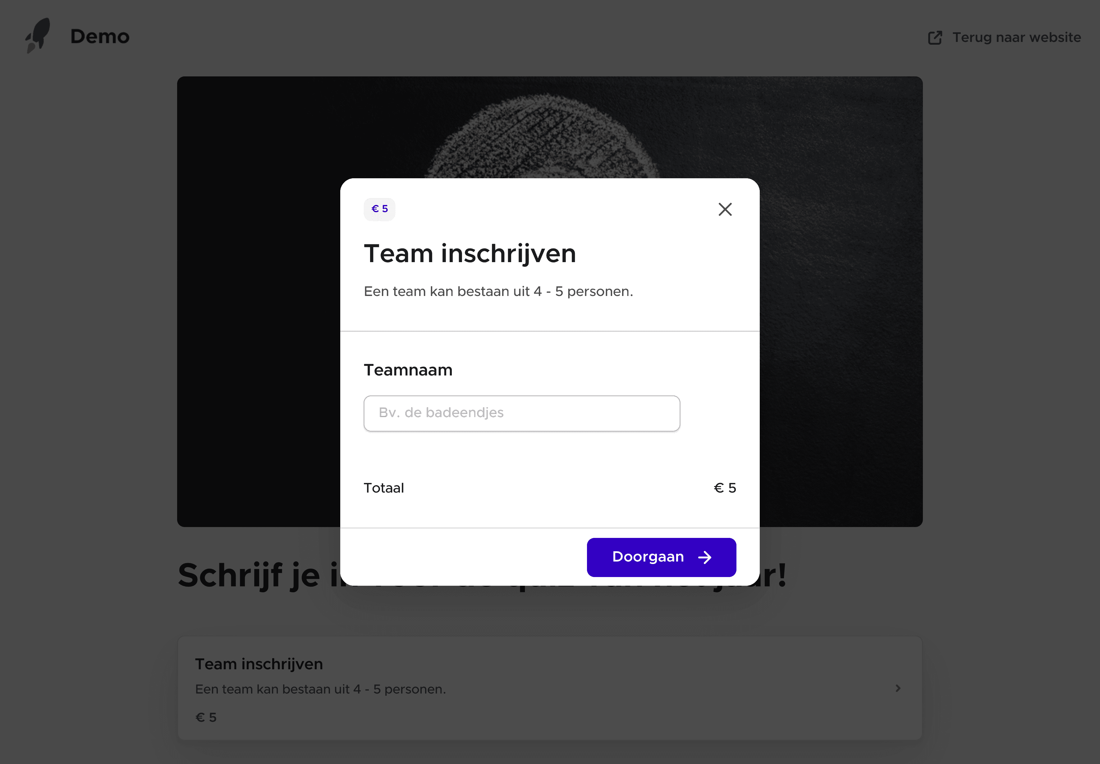 We hebben een demo opgezet waarbij je jezelf kan inschrijven voor een fictieve quiz, om het eens uit te proberen. Je hoeft hierbij niet te betalen.